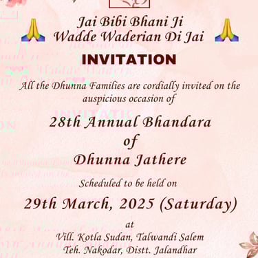 Invitation for 28th Annual Bhandara Held on 29-03-2025